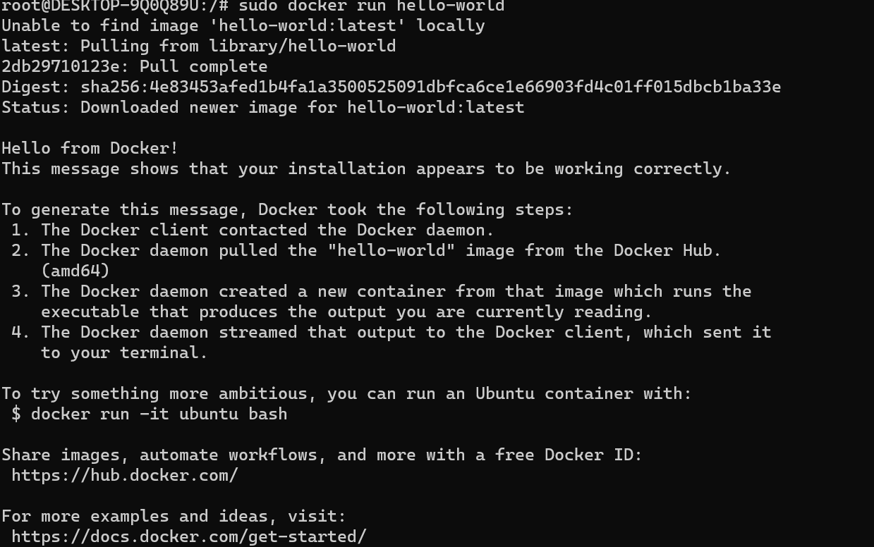 - Docker 데몬은 Docker 허브에서 "hello-world" 이미지를 가져왔습니다.