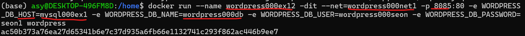 docker run --name wordpress000ex12 -dit --net=wordpress000net1 -p 8085:80 -e WORDPRESS_DB_HOST=mysql000ex11 -e WORDPRESS_DB_NAME=wordpress000db -e WORDPRESS_DB_USER=wordpress000kun -e WORDPRESS_DB_PASSWORD=wkunpass wordpress